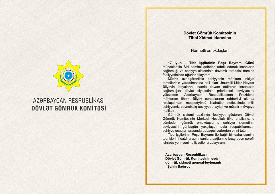 Председатель Государственного Таможенного Комитета Азербайджанской Республики, генерал-лейтенант таможенной службы Шахин Багиров направил поздравительное письмо сотрудникам Управления Медицинской Службы Государственного Таможенного Комитета по случаю 17 июня – Дня профессионального праздника медицинских работников.