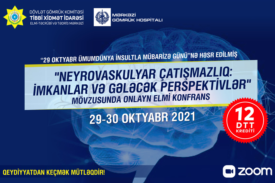 Завершилась научная онлайн-конференция "Нейроваскулярная недостаточность: возможности и будущие перспективы", проведенная 29-30 октября 2021 года при совместной организации Научно-Практического и Учебного Центра Управления Медицинской Службы Государственного Таможенного Комитета и Центрального Таможенного Госпиталя на платформе ZOOM и посвященная 29 октября – Всемирному дню борьбы с инсультом.