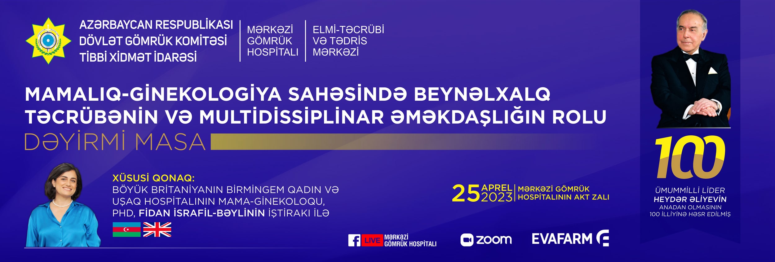25 aprel 2023-cü il tarixində Dövlət Gömrük Komitəsinin Tibbi Xidmət İdarəsinin Elmi-Təcrübi və Tədris Mərkəzinin və Mərkəzi Gömrük Hospitalının birgə təşkilatçılığı, Evafarm MMC-nin dəstəyi ilə "Mamalıq-ginekologiya sahəsində beynəlxalq təcrübənin və multidissiplinar əməkdaşlığın rolu" mövzusunda Dəyirmi Masa həyata keçiriləcək.
